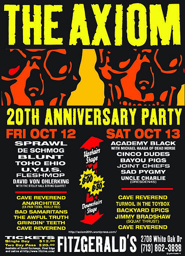 appropriate it was!" Yes, the little building on McKinney, which along with the Pik-N-Pak, gave shelter to the punk and indie bands back in the late 80's and early 90's will have seen 20 years since J.R. Delgado opened it's doors. Everyone has their favorite Axiom story [one of mine concludes with a guy named Kenny walking out naked on mushrooms onto McKinney as two officers in a patrol car slowwwwly come to a stop, take one look at Kenny, look at each other, think better of it, and slowwwly drive off.] The line-up is a pretty sweet list of some of the Axiom's most acclaimed graduates like Sprawl, De Schmog, Academy Black, Sad Pygmy, Cave Reverend, Turmoil in the Toybox, and Grinding Teeth.