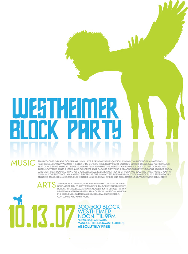 -A weekly blog where I highlight one show I definitely expect to attend (see *) and throw in a few more that I'd like to and might see given the money and the time.-This Week we have two big events worthy of your consideration in our spotlight; The Westheimer Block Party and The Axiom reunion Show.This Week's Double Spotlight