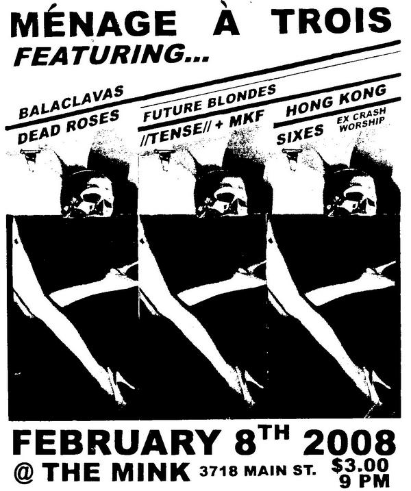 Fri., February 8 -Balaclavas, Dead Roses, Future Blondes, TENSE + MKF, Hong Kong (aka Indian Jewelry), AND Sixxes (ex-Crash Worship!)