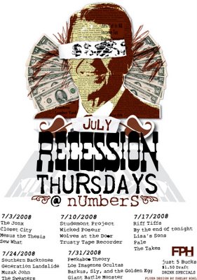 The Dow keeps falling, gas prices keep rising, and even Starbucks is closing stores. Well I say invest your money where you know you'll get the most return and that's recession Thursdays. Hell $5 to get in, Cheap Booze, and the ROI on the bands playing has consistently beat the S&P 500. Check out who is playing tonight (Link)